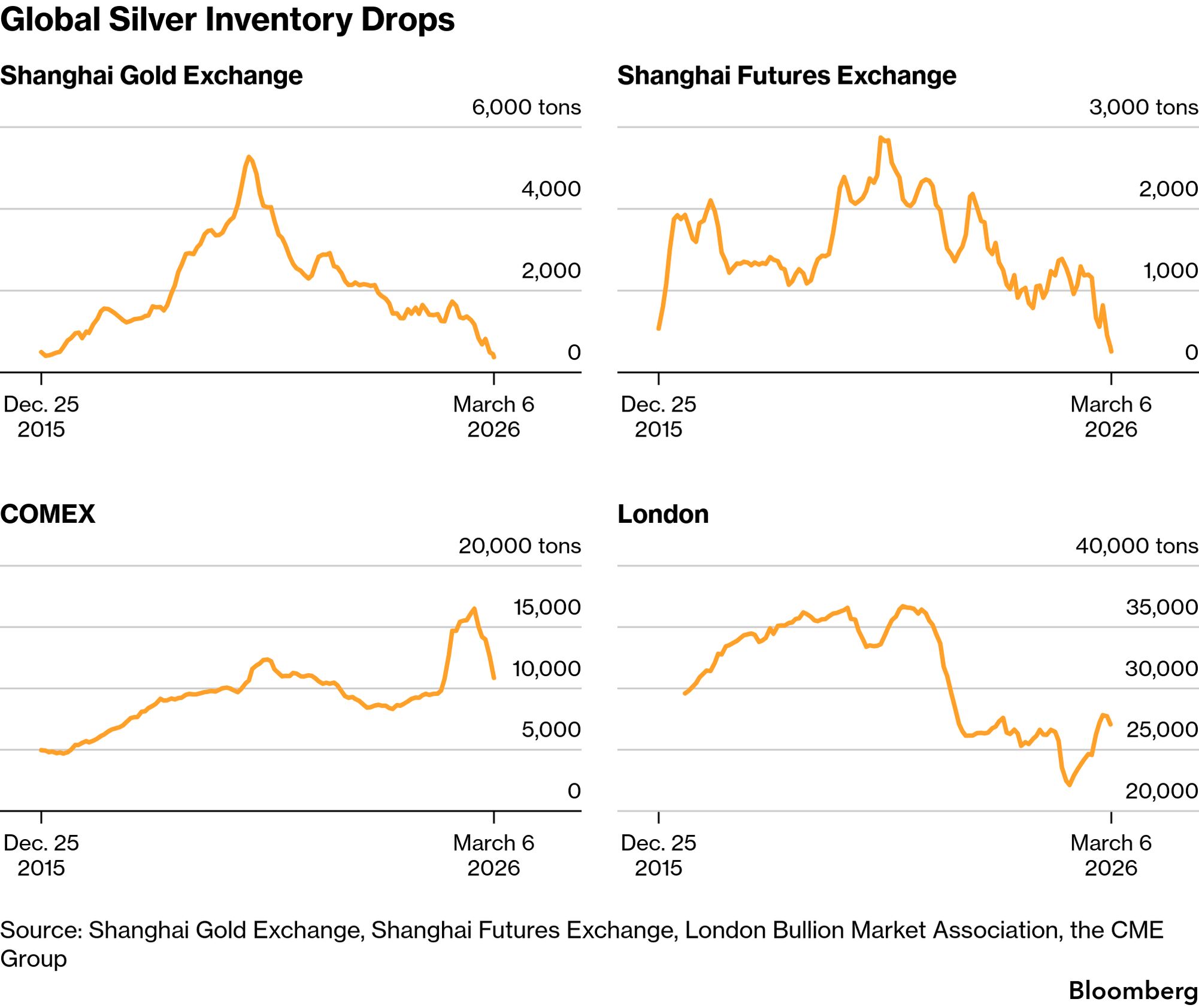 | China's ravenous appetite for silver lifted overseas purchases to an eight-year high at the start of 2026, as importers fed a surge in industrial and investment demand. That demand has pushed local prices well above international benchmarks, whittling down already-low exchange stockpiles and scooping up metal from abroad. Demand has come from both retail investors piling into silver bars (an alternative to increasingly pricey gold) and solar manufacturers front-loading production ahead of the removal of export tax rebates come April 1. The solar industry consumes about a fifth of annual supply, and is overwhelmingly located in China. | |