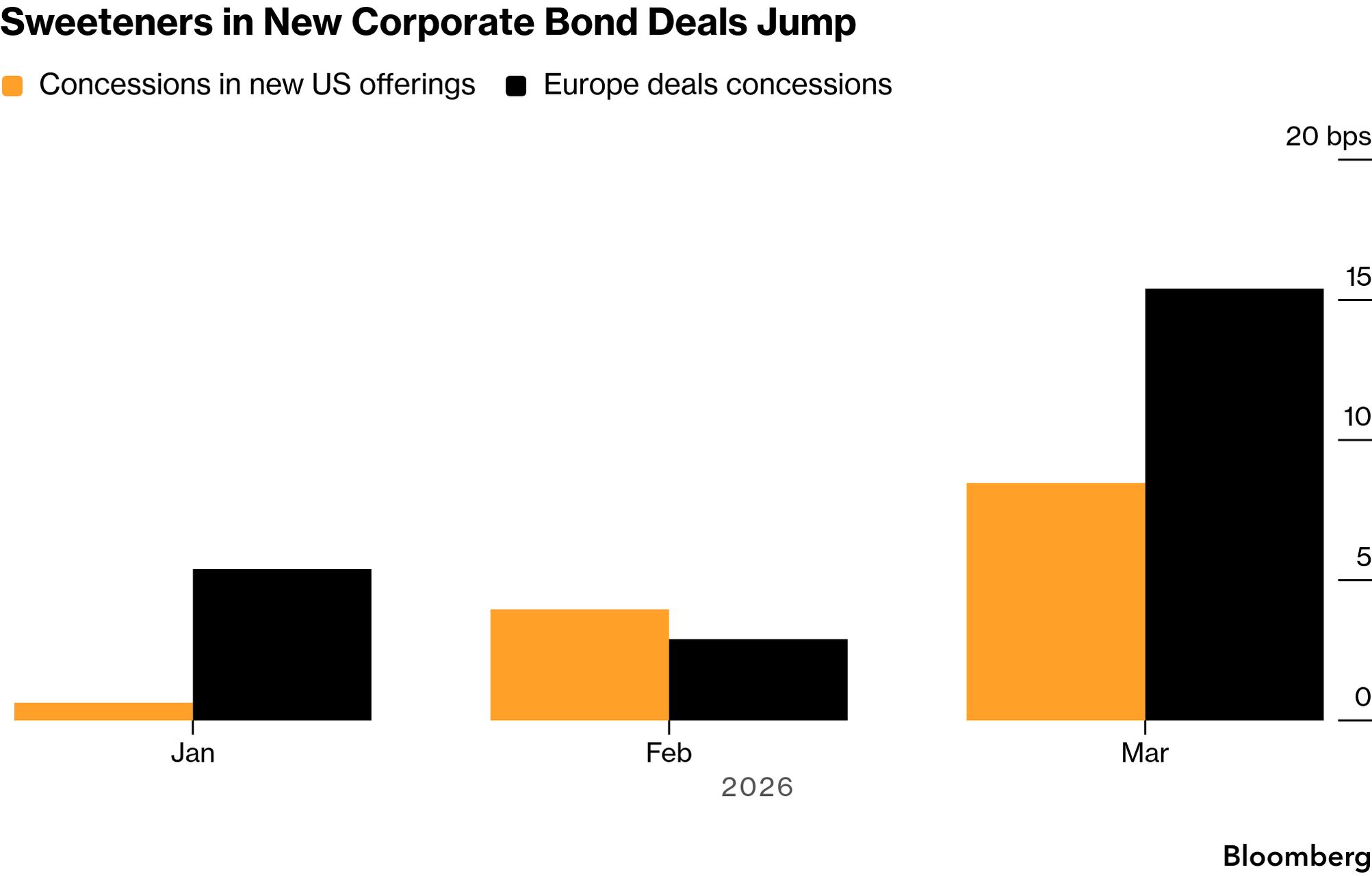| Credit investors are increasingly in the driver's seat, scoring some of the highest new issue concessions in years. That's because companies that seize the occasional window for bond offerings are competing to entice buyers who want to be compensated for a growing list of risks. Adding sweeteners is becoming an imperative to attract buyers, especially as companies have to compete with other borrowers on days when risk sentiment is strong enough to allow bond issuance to resume. The dynamic is turning into a money-maker for investors already having to navigate the disruption of artificial intelligence, an energy crisis and the prospect of higher inflation. | |