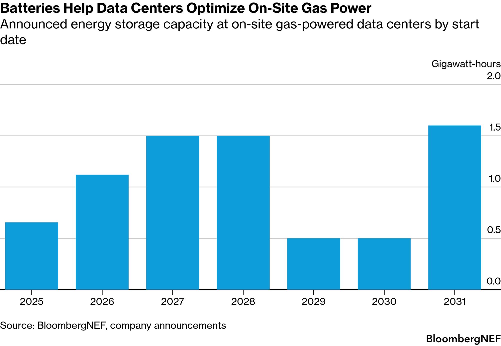 Renewables and batteries go hand in hand. But for US data center operators, batteries are increasingly a tool to pair with natural gas. Today’s newsletter looks at how energy storage is being used to deploy more fossil fuel in service of the AI boom. Plus, China’s local officials are under pressure to make sure the country meets its climate goals. Someone forward you this email? You can subscribe to the Green Daily for free news about the twists and turns of the energy transition. Charging with gasBy Mark Chediak and Michelle Ma The scramble to find enough power for artificial intelligence has data center operators looking for any solution. An unexpected one taking root pairs batteries — long seen as a key to adding more renewables — with fossil fuels. BloombergNEF has tracked 4.9 gigawatts of energy storage announcements that are co-located with on-site fossil fuel generation at data centers. That’s about 32% of announced global on-site data center battery capacity. The sites include some of the largest AI data center complexes under development, such as Elon Musk’s Colossus supercomputer in Memphis, Tennessee, and the combo has become so popular that companies such as Caterpillar Inc. and GE Vernova Inc. have announced products or partnerships pairing energy storage with gas generation.