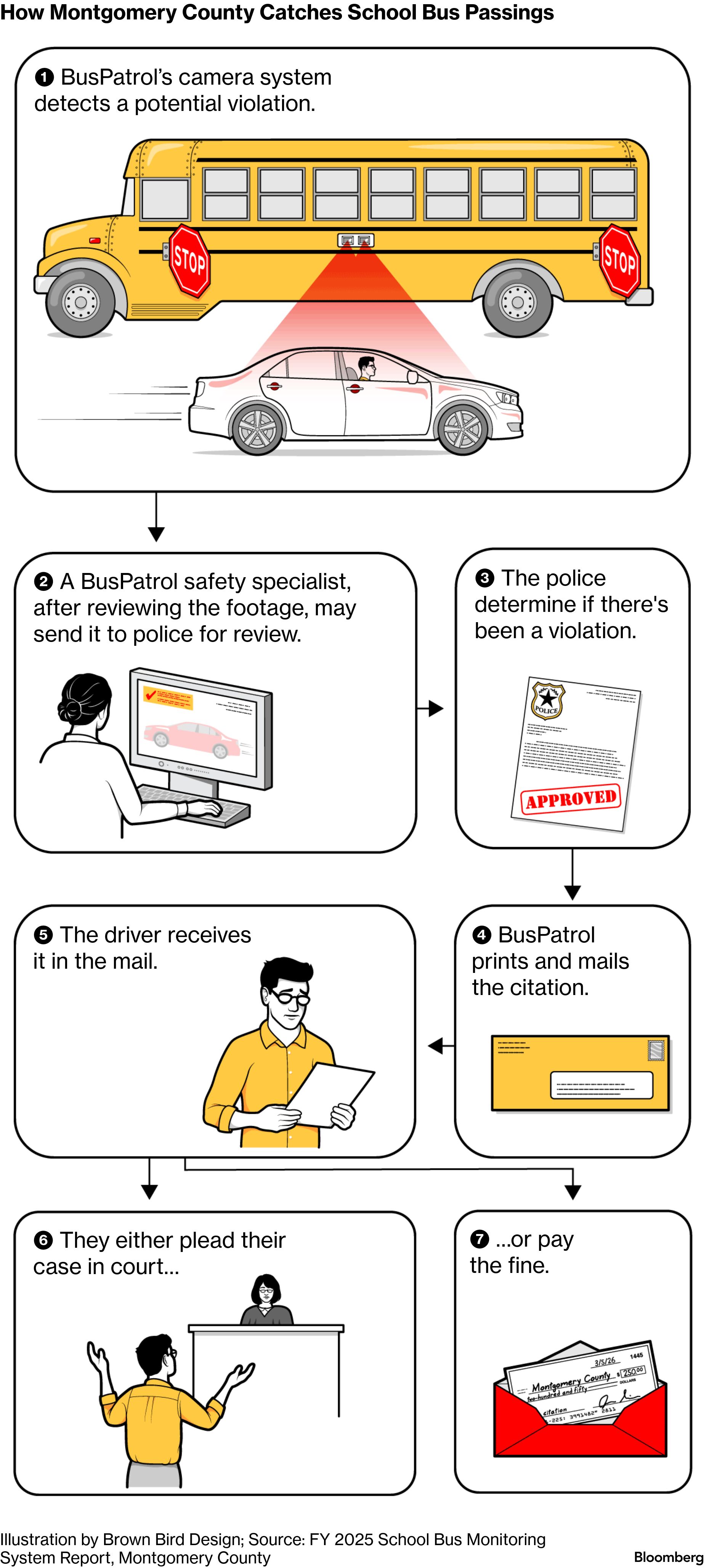 Welcome to Bw Reads, our weekend newsletter featuring one great magazine story from Bloomberg Businessweek. Today Byard Duncan writes about BusPatrol, a company that says its technology helps curb dangerous driving at no cost to cities. Public records from across the US often tell a different tale. You can find the whole story online here (free!). If you like what you see, tell your friends! Sign up here. Every weekday morning outside the 16-story apartment complex at 1400 East-West Highway in Silver Spring, Maryland, students step onto big yellow buses that take them to school. It’s not a particularly pleasant spot: The building faces a fenced-off construction site across six lanes humming with Washington metro-area commuter traffic. But this is an important place for Montgomery County. In addition to students, the buses are collecting valuable data every time they stick out their stop signs (“stop arms,” in transportation lingo) and flash their red lights. Artificial-intelligence-powered cameras attached to these buses record vehicles that fail to halt—vehicles, in other words, that violate the state law requiring all lanes of traffic to halt for a stopped school bus with its stop arm extended. The footage is sent to local police for review. If they decide the law was broken, the driver receives a $250 ticket in the mail. There are a lot of scofflaws near 1400 East-West Highway. More than 11,500 tickets have been issued here over the past decade, making it among the county’s most heavily ticketed stops. The county views this as a win-win: Bad drivers get dinged, and the government gets paid. That is how BusPatrol LLC, the company that operates the cameras on Montgomery County’s school buses, presents itself to local officials around the country. In exchange for a portion of citation revenue, it plugs in the cameras, records the violations, bundles up the evidence and mails tickets after police review. BusPatrol started operating in Montgomery County in 2017. At the time, local police assured residents that violations would subside as drivers learned their lesson. Yet critics of BusPatrol say municipalities are getting a bad deal. In Montgomery County, after more than 375,000 tickets and $92 million in issued fines, there’s been little reduction in violations and no evidence of a decline in collisions near stopped school buses, according to county records and Bloomberg Businessweek’s review of local news reports and stop-arm camera footage. The county has done little to change the infrastructure at its most ticketed stops; it’s repeatedly said there are no safety concerns at most of these locations. Because of the financial structure of the program, the county transferred millions to its stop-arm technology providers for the first three years and kept no revenue itself, while also spending hundreds of thousands of tax dollars to review the AI’s work. Meanwhile, there’s evidence the program is heavily burdening residents who either can’t or don’t pay the fines. BusPatrol has attached its cameras to about 35,000 buses in 24 US states and more than 350 school districts. Public records Businessweek obtained show that, because of their contracts with BusPatrol, many local agencies have spent years effectively acting as revenue generators for a for-profit company, ticketing thousands of drivers and sending most of the funds back to BusPatrol. Citations often remain high year after year, despite the company’s promises they will decline. Municipalities can wind up keeping very little money from their partnerships because of the company’s high monthly technology fees. Montgomery County Vision Zero Coordinator Wade Holland defended the partnership, noting that the illegal passing of stopped school buses is a national problem. “By having a school bus arm monitoring program, Montgomery County is able to hold drivers accountable, educate drivers about their responsibilities around a stopped school bus, and have another data source to understand what is happening when our students are getting picked up or dropped off,” he said in a statement. The Montgomery County Police Department declined Businessweek’s request for an interview, pointing instead to the county’s annual reports on the BusPatrol program. In a statement, BusPatrol spokesperson Kate Spree said the company’s services “provide school districts with critical safety technology and enforcement support at no cost to taxpayers or law-abiding drivers, helping communities protect students traveling to and from school.” BusPatrol said it works with municipalities to establish financial structures that allow the company to recoup its upfront investment and operating costs. In many cases, it said, the cost of operating cameras can equal or exceed violation revenue, but that in the latter scenario, the company covers the gap. It also pointed to a recent report on school bus safety by the Governors Highway Safety Association that recommends stop-arm cameras as a solution.