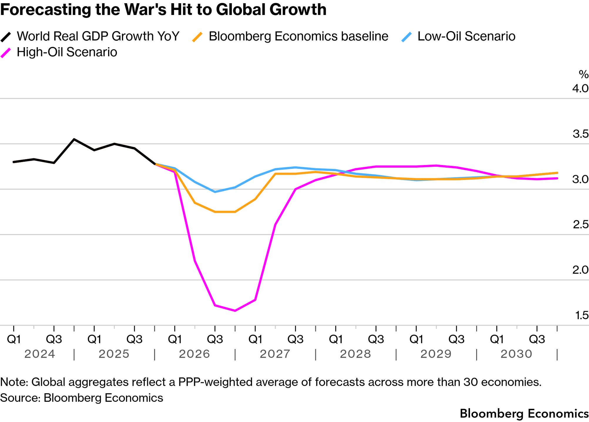 Need-to-Know ResearchBy now it’s conventional wisdom that the global economy’s 2026 performance will come down to a single variable: What the price of oil will average over the course of the year. Bloomberg Economics has calculated the difference between the upside and downside cases. In a negative scenario with oil at $170 a barrel, global GDP would expand just 2.2% this year, compared with 3.4% in 2025, Tom Orlik and Jamie Rush wrote in a note last week. But in a positive scenario, with oil back at $65, the world could achieve a 3.1% expansion. In monetary terms that amounts to just over $1 trillion – the equivalent of a little more than Switzerland’s economy, or somewhat less than Saudi Arabia’s.