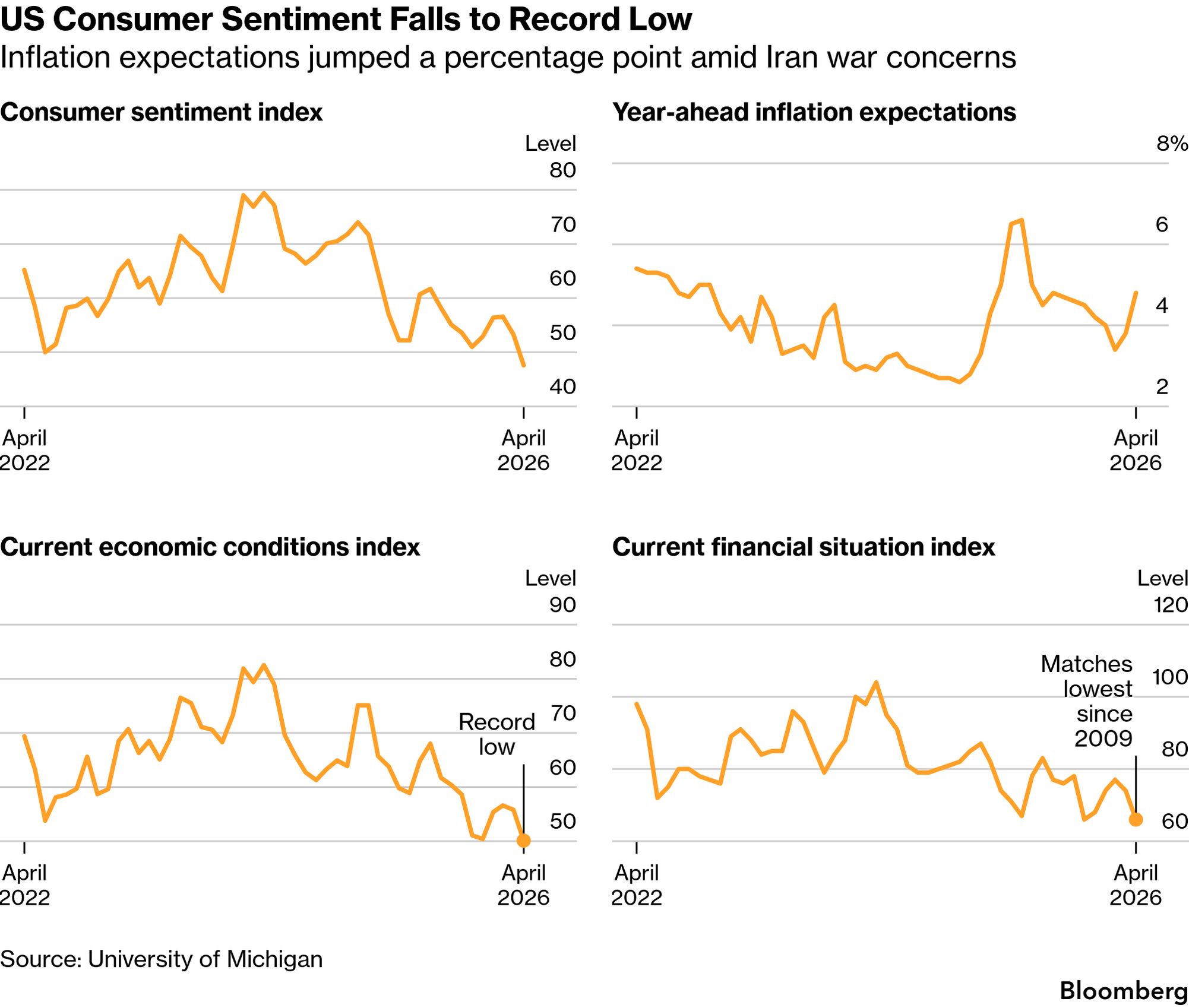 Another Friday has managed to deliver unpleasant news about the US economy. According to the University of Michigan, consumer sentiment fell in recent weeks to a record low, an historic reading likely fueled by the US-Israel war with Iran and the effect it’s had on already-bubbling inflation. The preliminary April sentiment index plummeted to 47.6 from 53.3 in March. Americans expect prices to rise at an annual rate of 4.8% over the next year.