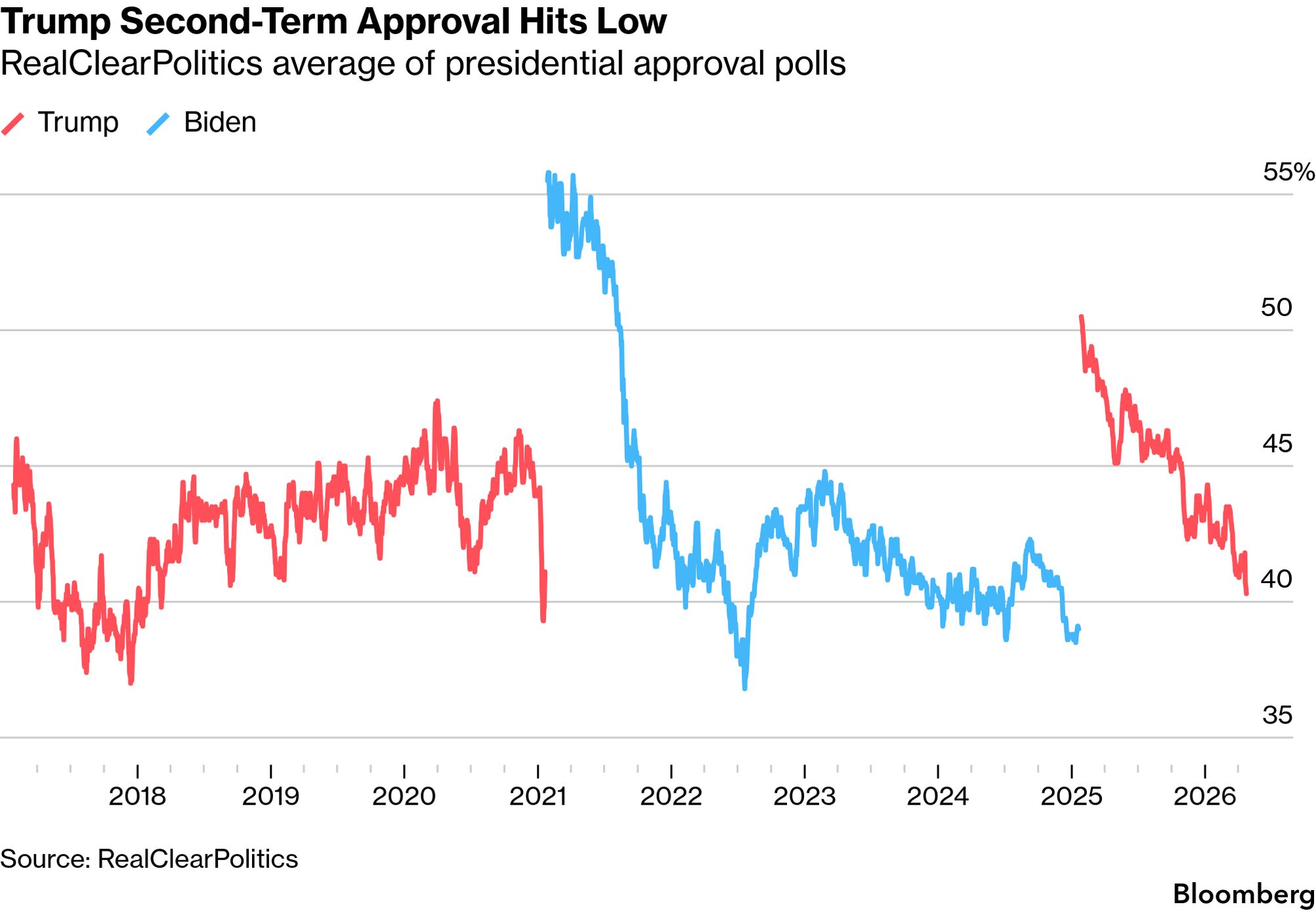No fewer than 10 public opinion polls dropped this week, and it’s hard to find any silver linings for Trump. His approval rating in the RealClearPolitics average is 40.3%, the lowest of his second term. Some individual polls are even worse: A CNBC poll released Wednesday showed Trump at 40% approval, the lowest mark in that poll in both his first and second terms. The Republican pollsters that Trump sometimes cherry picks for good news aren’t much help: Rasmussen Reports (44%), its sister company RMG Research (42%) and Echelon Insights (41%) all largely track the downward trend. Analyst Nate Silver’s weighted average of polls is at 39%. “For historical context, that’s right around where his net approval was at the end of his first term, in the aftermath of January 6th,” the Silver Bulletin’s Eli McKown-Dawson wrote. — Gregory Korte What’s NextKing Charles is scheduled to begin his first state visit to the US on Monday and will address Congress on Tuesday. The Virginia Supreme Court hears arguments Monday on of the pending attempts to block the state’s redistricting referendum. The Conference Board’s gauge of consumer confidence will be published Tuesday. The Florida legislature convenes a special session on redistricting Tuesday. Durable goods orders for March will be reported Wednesday. The Fed Open Markets Committee makes a decision on its benchmark interest rate on Wednesday. The March personal consumption expenditures index, the Fed’s preferred inflation gauge, will be published Thursday. More From BloombergLike Washington Edition? Check out these newsletters:
