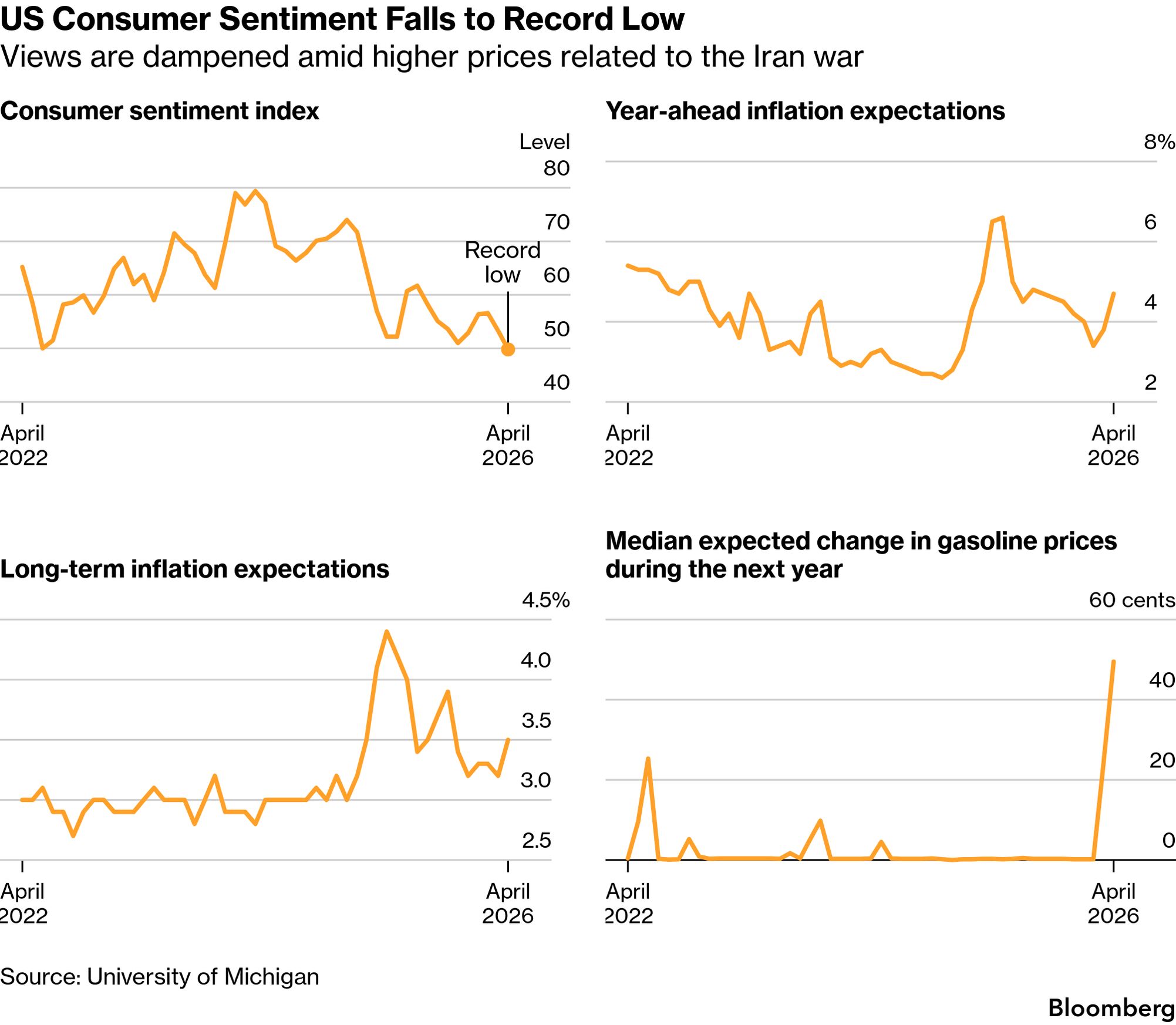 Today’s Top NewsTrump will send envoys to Pakistan with the intention of meeting with Iranian officials, while Tehran sounded a pessimistic tone on the prospects for talks to end the eight-week war roiling the global economy. The US sanctioned a Chinese oil refinery as well as dozens of shipping firms and vessels that transport Iranian oil, as the Trump administration ramps up economic pressure on Tehran ahead of diplomatic talks. The Justice Department released a sweeping report calling for a significant expansion of the federal death penalty, including policy recommendations for faster executions and adopting additional execution methods. Consumer sentiment in the US fell in April from a month earlier to a record low, reflecting the worries of inflation-weary Americans about the economic fallout from the war with Iran.