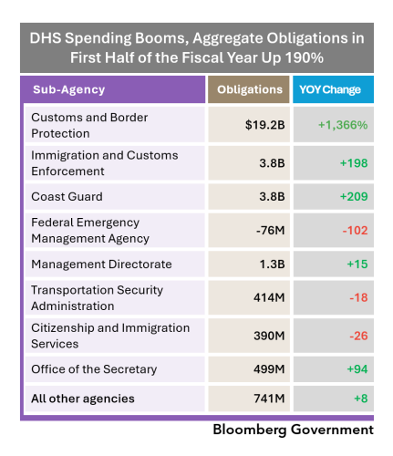 Go Deeper With BGOVFirst-half fiscal year procurement spending spikes within the Department of Homeland Security led to a 190% increase for the agency, compared with the first half of fiscal 2025, BGOV contracting analyst Maika Ito writes.