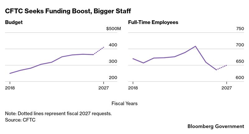 Go Deeper With BGOVFacing soaring volumes in prediction markets and crypto, the Commodity Futures Trading Commission is asking Congress for $410 million for fiscal 2027, a 12.3% boost. BGOV’s Andrew Ramonas tracks the climbing budget and plunging staff numbers.