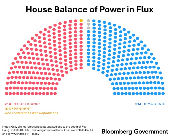 Go Deeper With BGOVRepublicans’ tiny House majority keeps billowing in and out like a sail. The latest shift came when New Jersey Democrat Analilia Mejia was sworn in yesterday. Republicans now have a 218-214 majority. Given a few vacancies, Speaker Mike Johnson can only lose one vote with all members present and still pass measures along party lines — a problem that has frequently stalled major legislation. He briefly gained a wider majority with the swearing in of Republican Representative Clay Fuller last week. Later in the week, the House lost two more members: Republican Tony Gonzales of Texas and Democrat Eric Swalwell of California, both of whom resigned over sexual misconduct allegations. And it ain’t over: The House Ethics Committee will meet today to decide what, if any, punishment should be recommended for Florida Democrat Sheila Cherfilus-McCormick. Expulsion is one option.