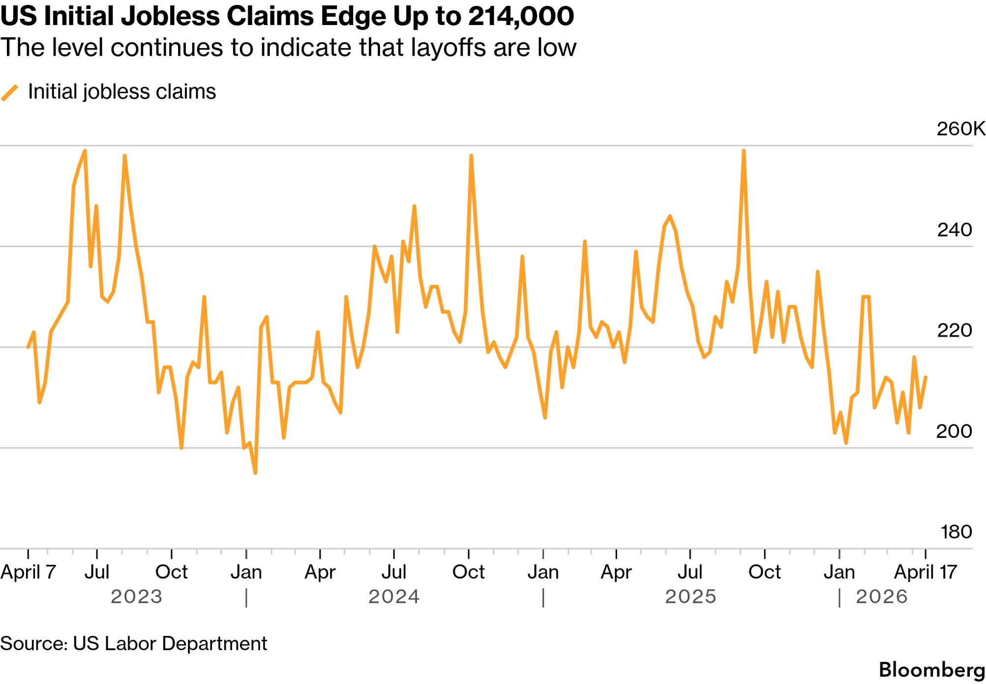 The Trump administration plans to extend a shipping waiver that allows foreign tankers to move oil and gasoline around the US, a bid to counter supply disruptions and higher prices triggered by the war in Iran. US forces boarded a supertanker carrying Iranian oil in the Indian Ocean as the Navy steps up its blockade of the Islamic Republic’s shipping amid a standoff that’s left the Strait of Hormuz effectively closed. Trump’s order for the US to attack Iranian gunboats is the latest sign that an asymmetrical war-fighting strategy is stymieing the world’s mightiest navy, with US aircraft and destroyers forced to track swarming speedboats. Only one person has been approved so far for Trump’s “Gold Card” Visa program granting foreigners US residency for a $1 million fee, according to Commerce Secretary Howard Lutnick. House Republicans unveiled their latest plan to extend a US spy powers tool after a week of rebellion from privacy hawks forced leadership to settle for a 10-day extension as they worked through negotiations. Immigration and Customs Enforcement officers were told verbally weeks ago to stop entering homes without judicial warrants, marking a shift away from some of the agency’s most aggressive enforcement tactics. Regeneron Pharmaceuticals reached a deal with the Trump administration to lower drug costs for some Americans and won US approval for its gene therapy to treat a rare form of deafness. Applications for unemployment benefits in the US increased by 6,000 to 214,000 last week, though they remain at a level consistent with low layoffs.