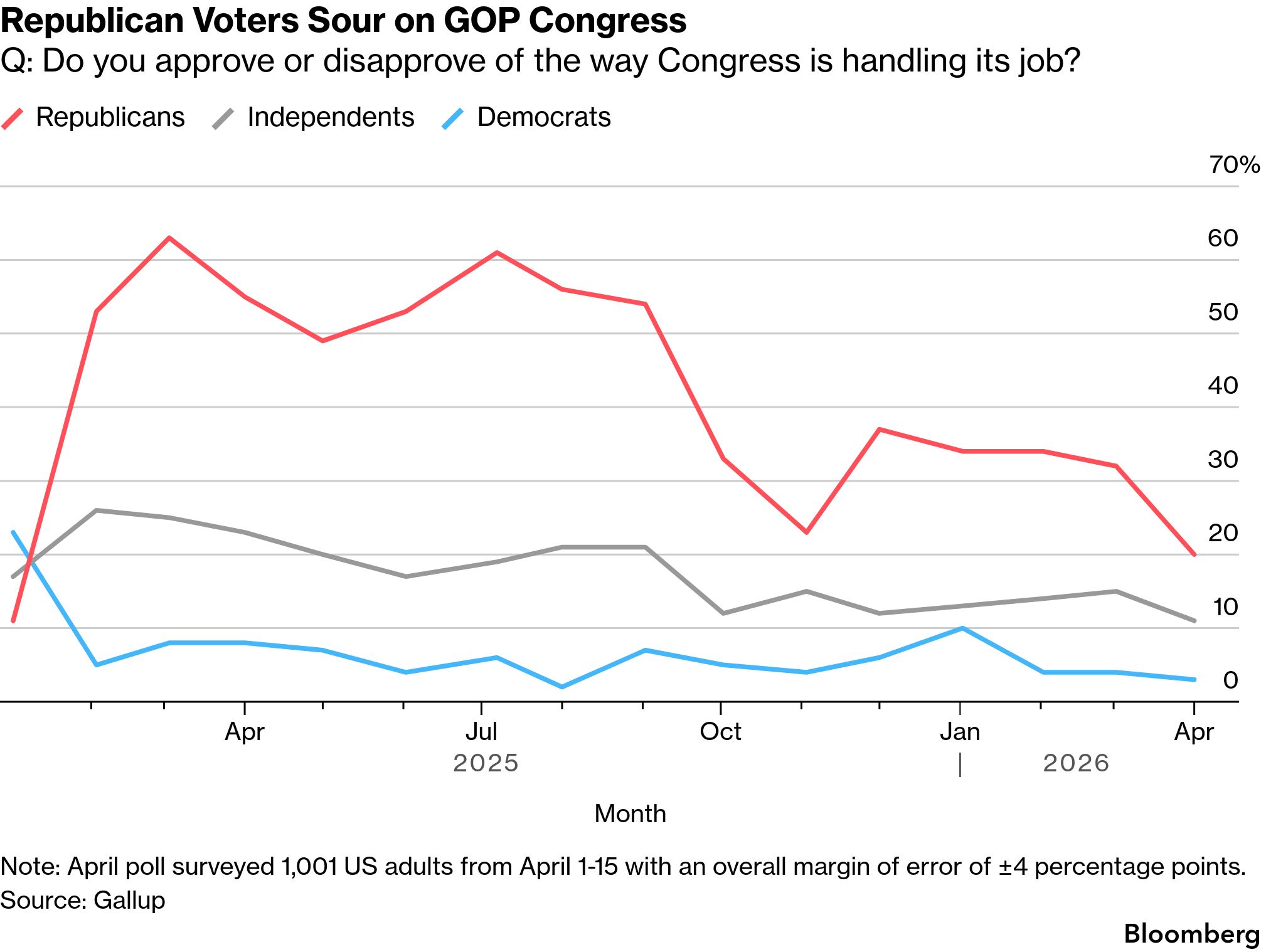 It’s no surprise that Americans hold Congress in low esteem: With the exception of a brief spike after the 9/11 terrorist attacks, its approval has been mostly underwater for the last half-century. What’s remarkable is how bipartisan that sentiment has become. Gallup’s latest measure of congressional approval finds that Republican voters are driving the near-record low ratings, plunging to 20% approval of a Congress led by their own party. Gallup pollster Megan Brenan says government shutdowns, ethics scandals, the Iran war and inability to pass a voter identification law may all be contributing to the decline. While midterm elections tend to be referenda on the president, the congressional approval numbers suggest that the anti-incumbency mood goes far deeper than Trump. — Gregory Korte What’s NextThe University of Michigan’s final read of consumer sentiment in April will be published tomorrow. King Charles is scheduled to make his first state visit to the US next week. The Conference Board’s gauge of consumer confidence will be published Tuesday. The Florida legislature convenes a special session on redistricting Tuesday. Durable goods orders for March will be reported Wednesday. The Fed Open Markets Committee makes a decision on its benchmark interest rate on Wednesday. The March personal consumption expenditures index, the Fed’s preferred inflation gauge, will be published next Thursday. More From BloombergLike Washington Edition? Check out these newsletters: