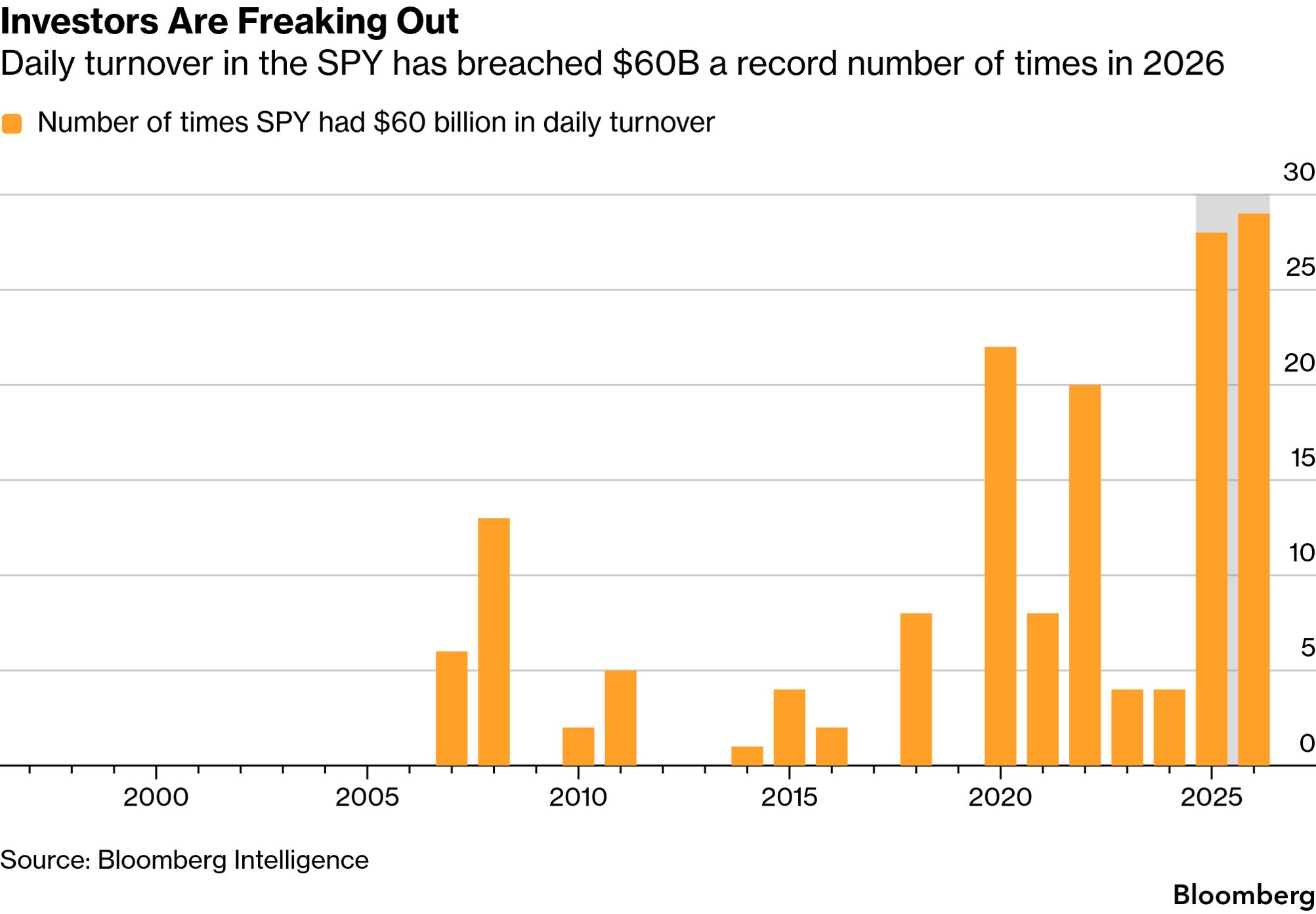 It will take time to see the full price tag for those results. We’re left to watch how quickly the economy recovers, what the latest rupture with Europe means long-term, the full tab to US taxpayers, and if the fighting has diminished US readiness elsewhere. “If he was going to back down, he did so in the worst way,” wrote Jennifer Kavanagh, director of military analysis at Defense Priorities, a libertarian think tank. “Raising the stakes so high beforehand, he maximized the damage to his credibility & global perceptions of U.S. power. This is a clear strategic defeat for the U.S.” Top NewsWall Street is getting its freak (out) on and because this is Bloomberg, yes, we have a data point for that. The Bloomberg Intelligence “freak out” indicator (it’s based on trading volume but don’t ask us to explain this early in the morning) has been hit 29 times this year. That’s already more than all of 2025. Can’t imagine why.